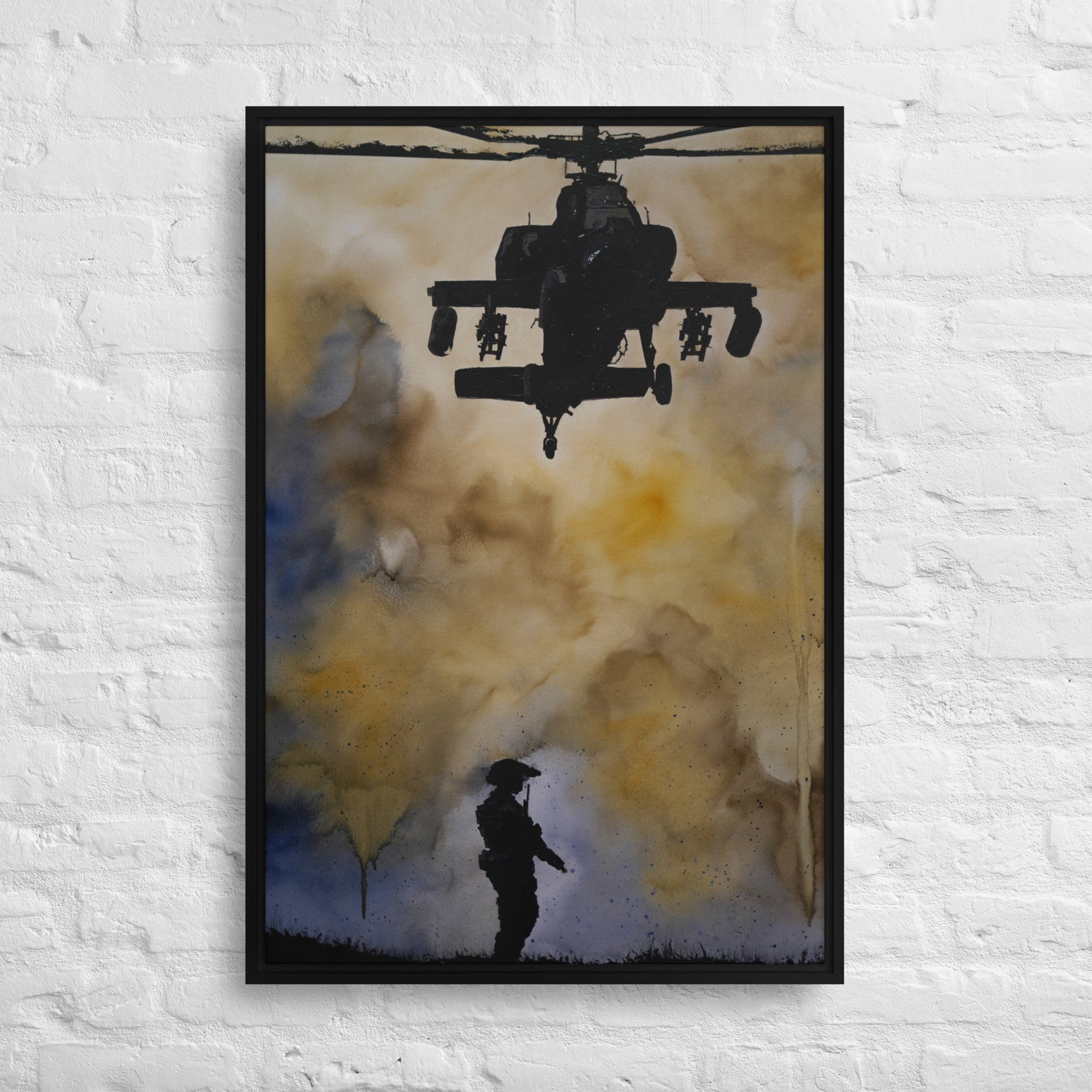 - The framed canvases with brown and black frames have a black inside around the canvas, and the canvases with white frames have a white inside around the canvas.