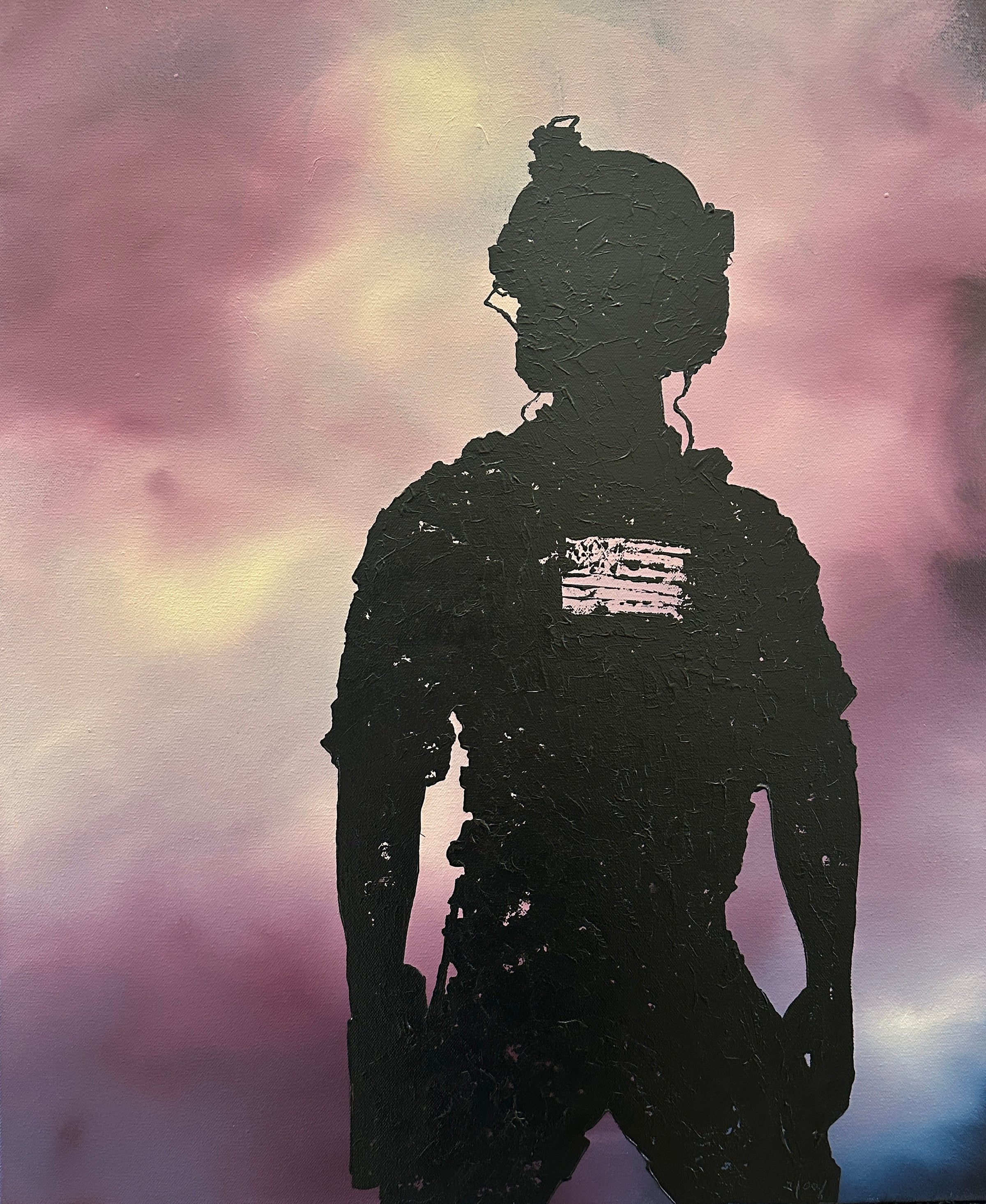 "What I Stand For" is an original, 1 of 1, painting by Invader Girl, that showcases a silhouetted figure in military style equipment ready to engage the unknown. Head held high, standing ready to face whatever comes their way.