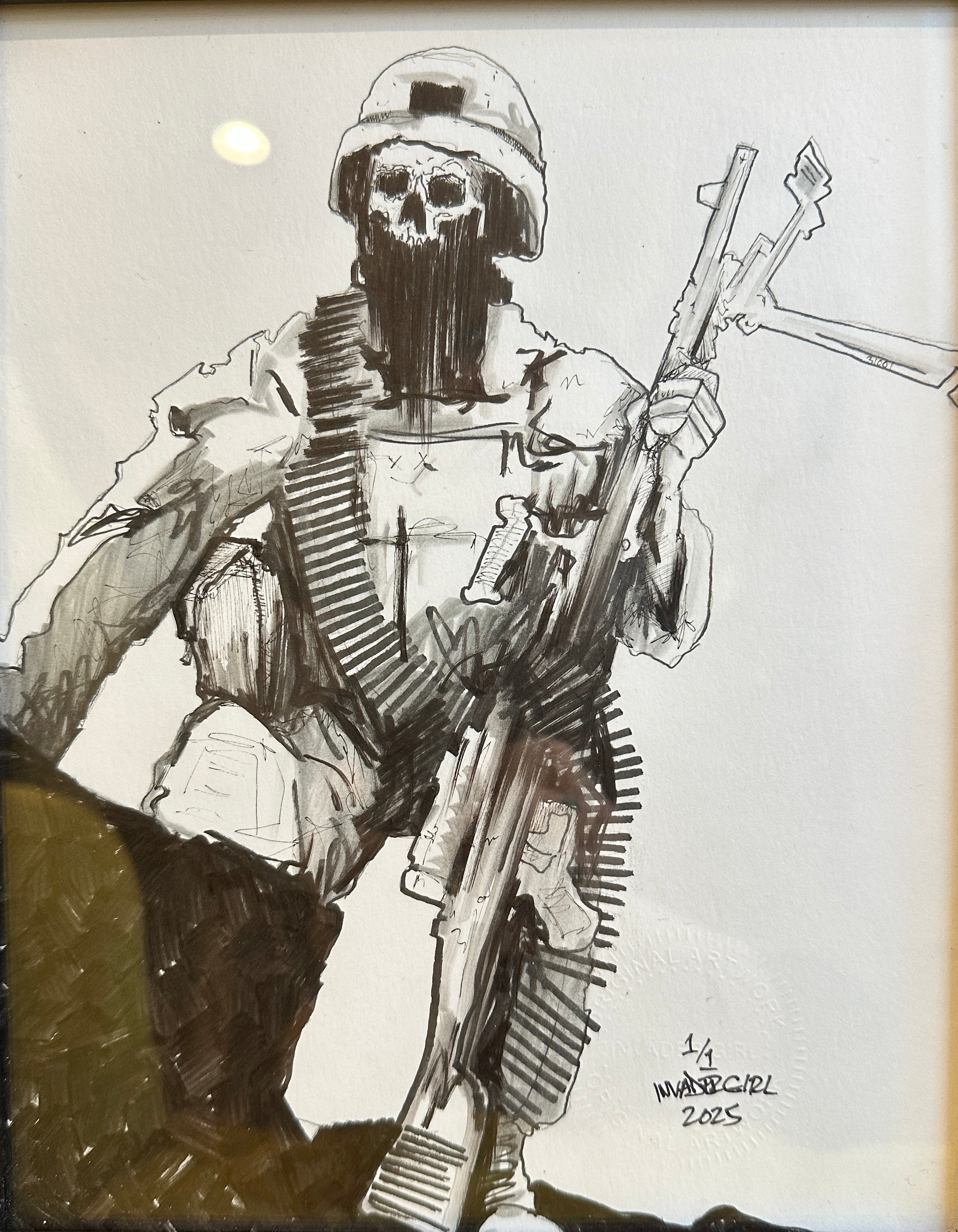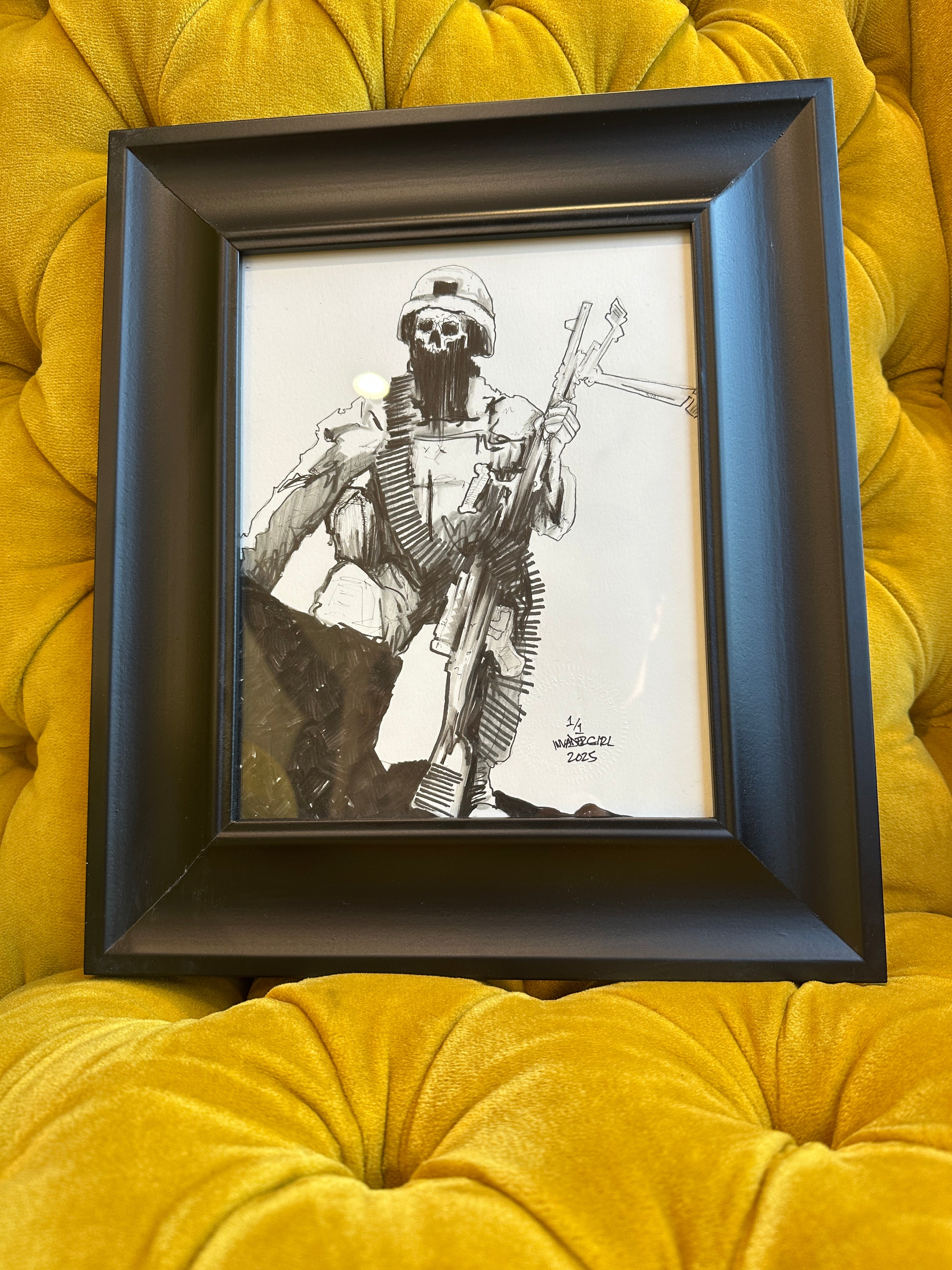 This is an 8x10 drawing done of heavy weight paper and ink. This drawing comes framed. This is a 1 of 1 original drawing from Invader Girl.