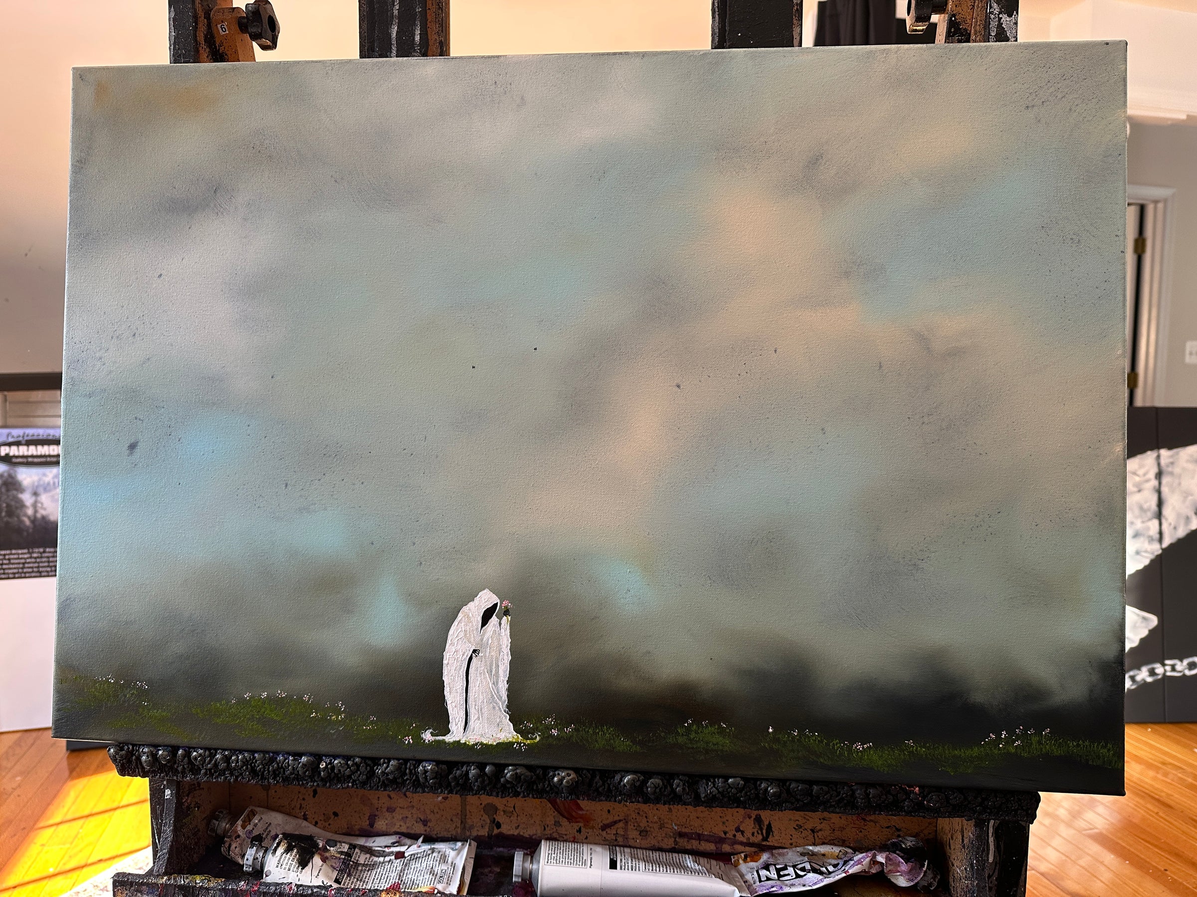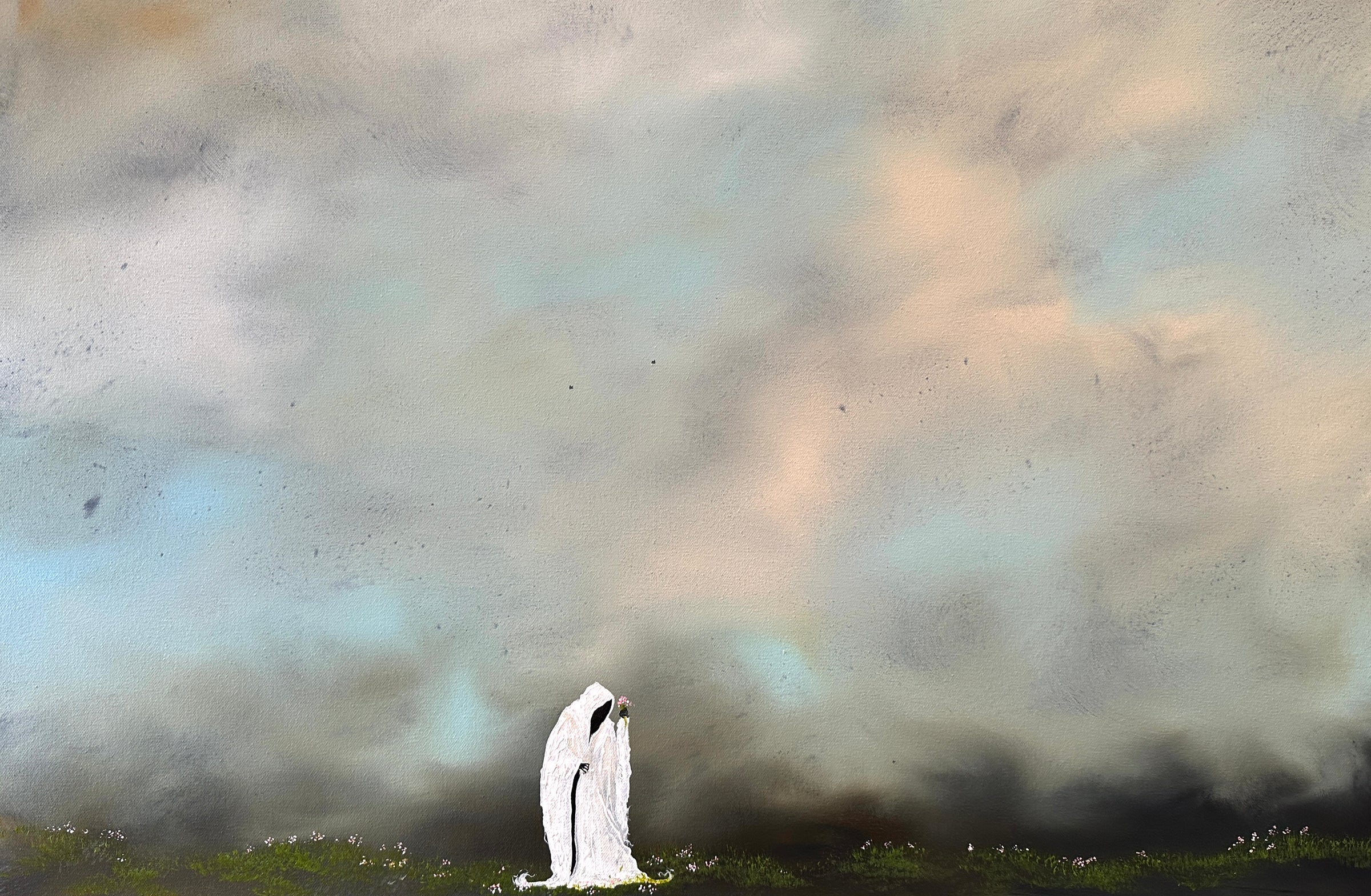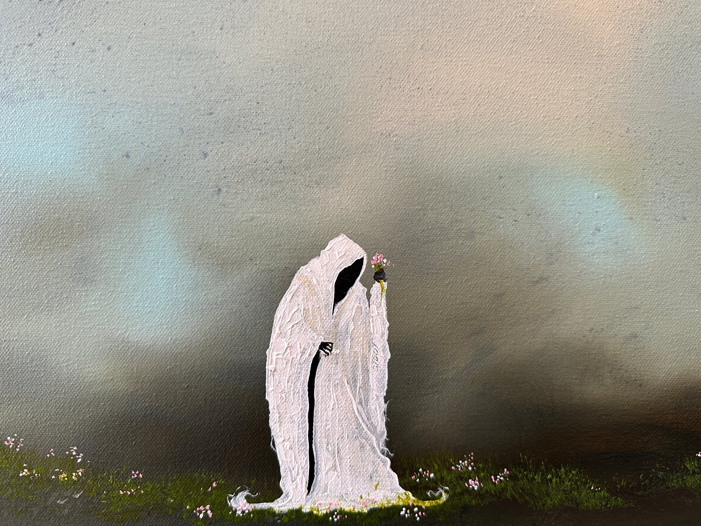This striking 20×30 inch original canvas juxtaposes the macabre with the delicate, as the grim reaper stoops to gather wildflowers. Bold palette knife work and heavy body acrylics create rich texture and depth, with dramatic contrasts between shadow and light that draw you into this contemplative scene.