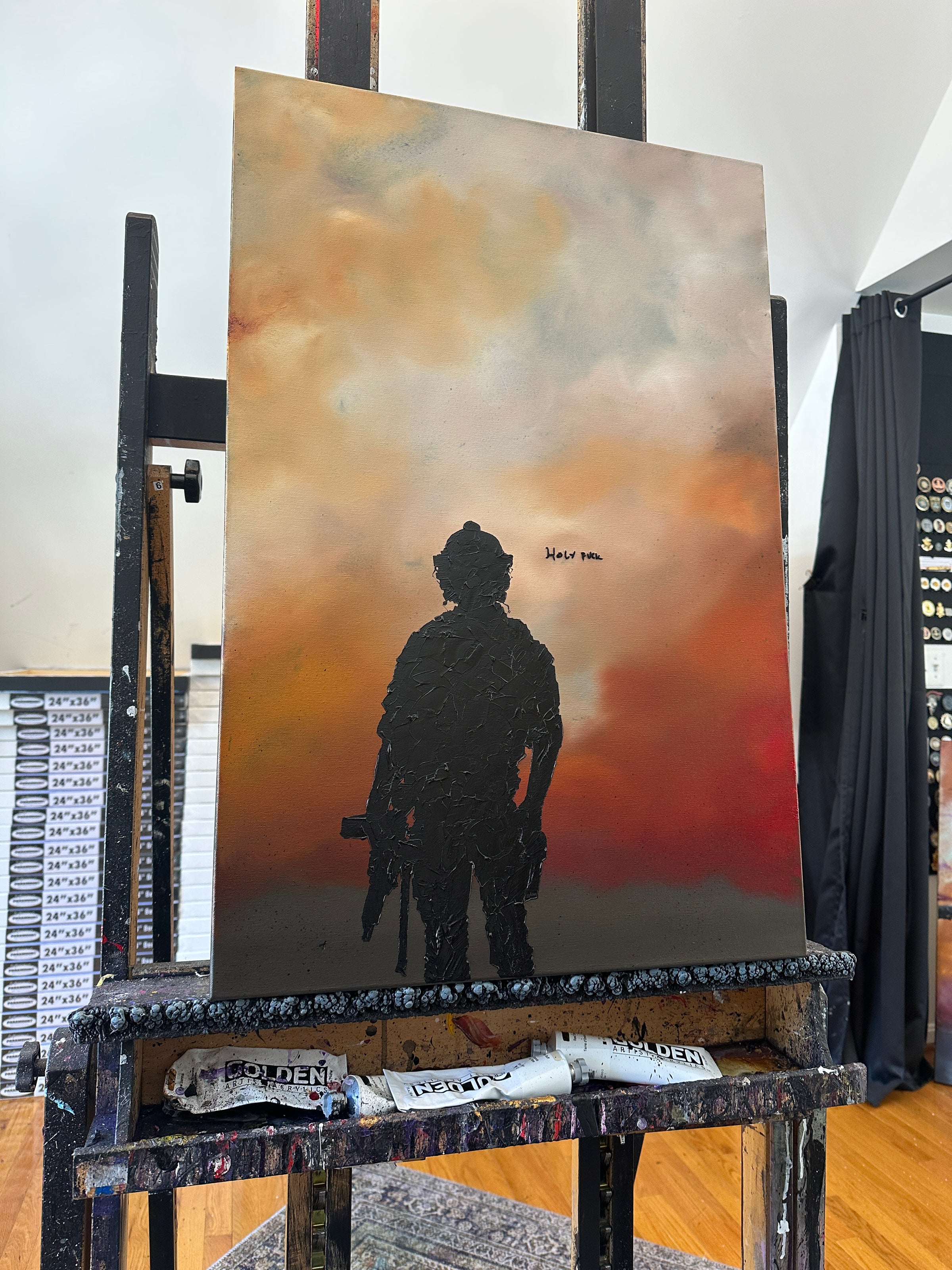 This is 20x30 inch canvas done in heavy body acrylics, pallet knife and hand embroidered. This is a 1 of 1 original from Invader Girl.