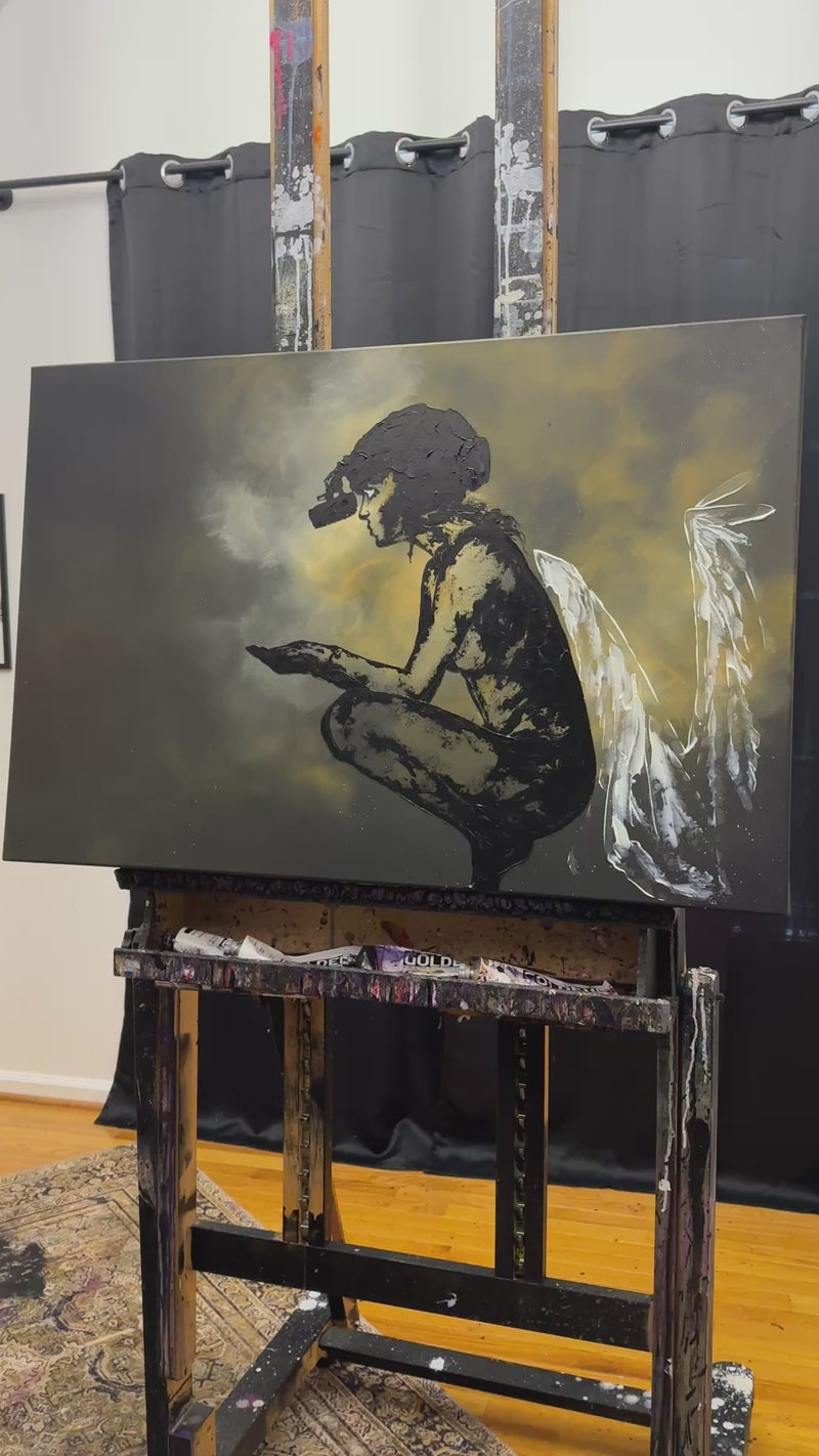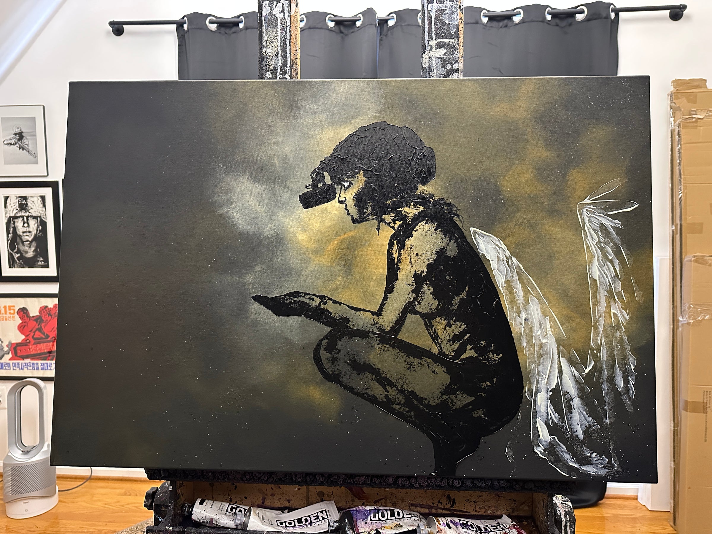 This is a 24x36 inch canvas. Painting is done in heavy body acrylics. Some portions of this painting do glow in the dark. This is a 1 of 1 original painting by Invader Girl.