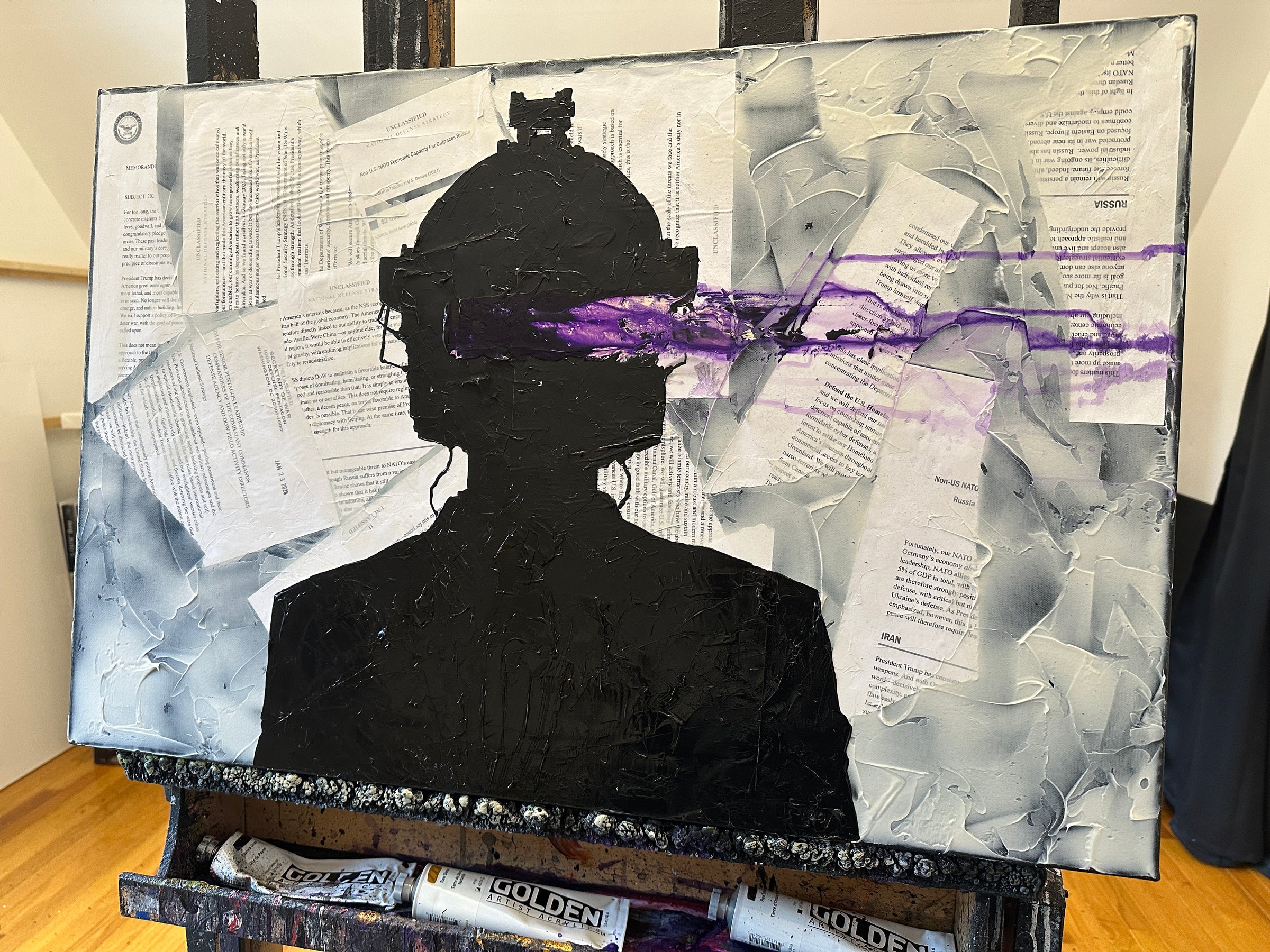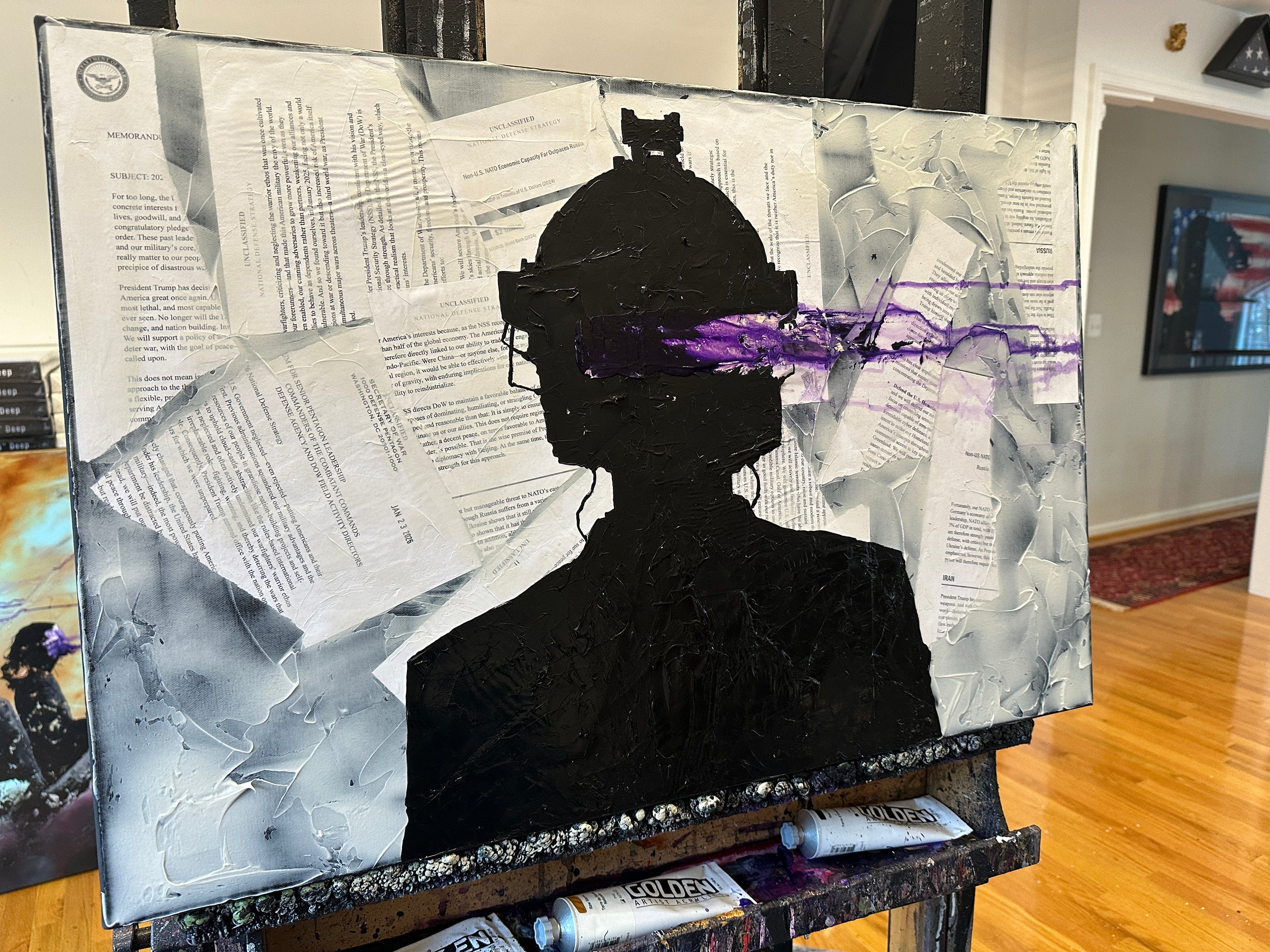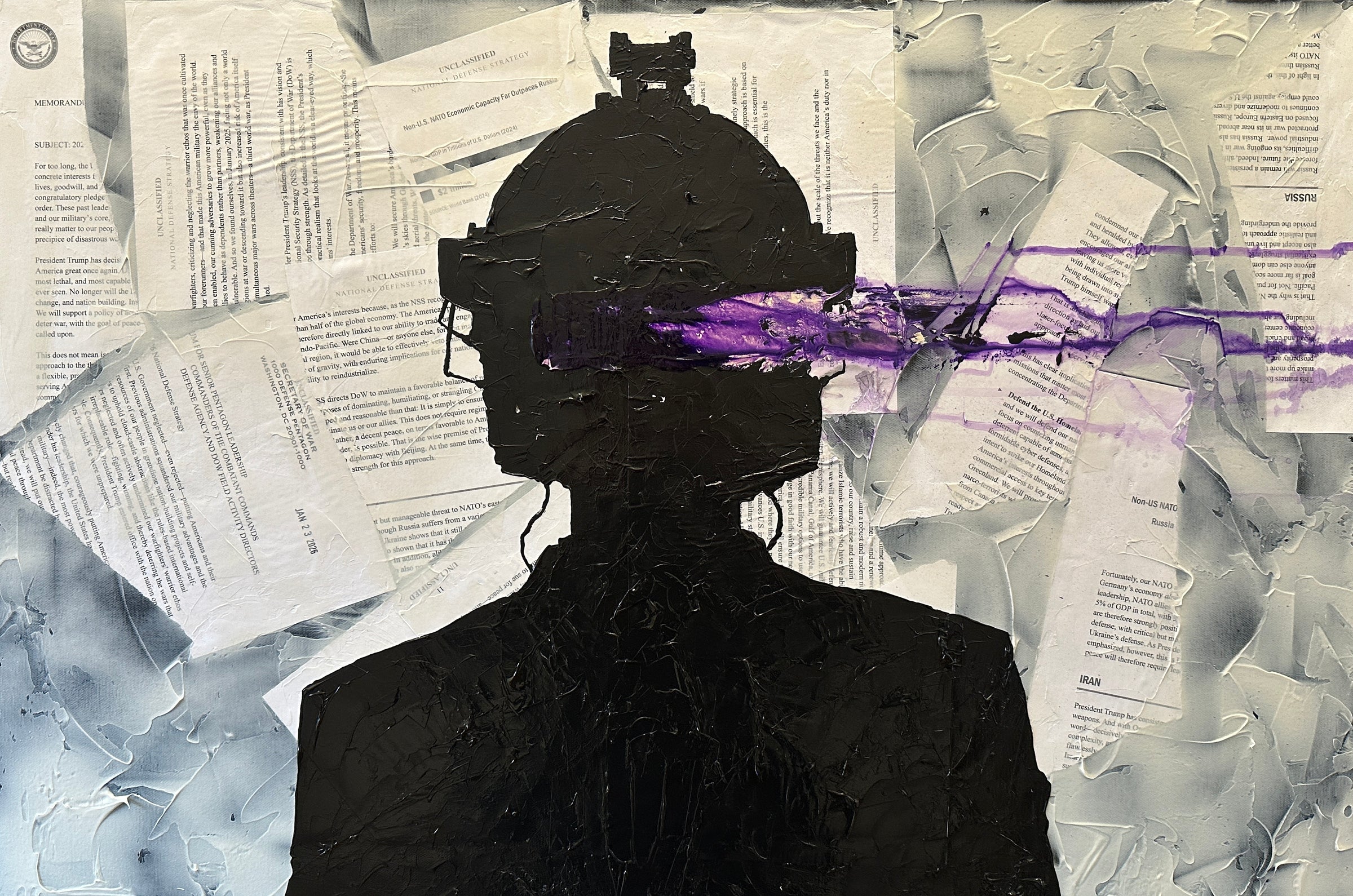 This haunting 20x30 inch original painting confronts the viewer with a blacked-out military figure—anonymous, faceless, reduced to silhouette. Clad in combat helmet and suit, the soldier stands as a stark symbol of duty stripped of identity, a vessel for commands issued from above.
