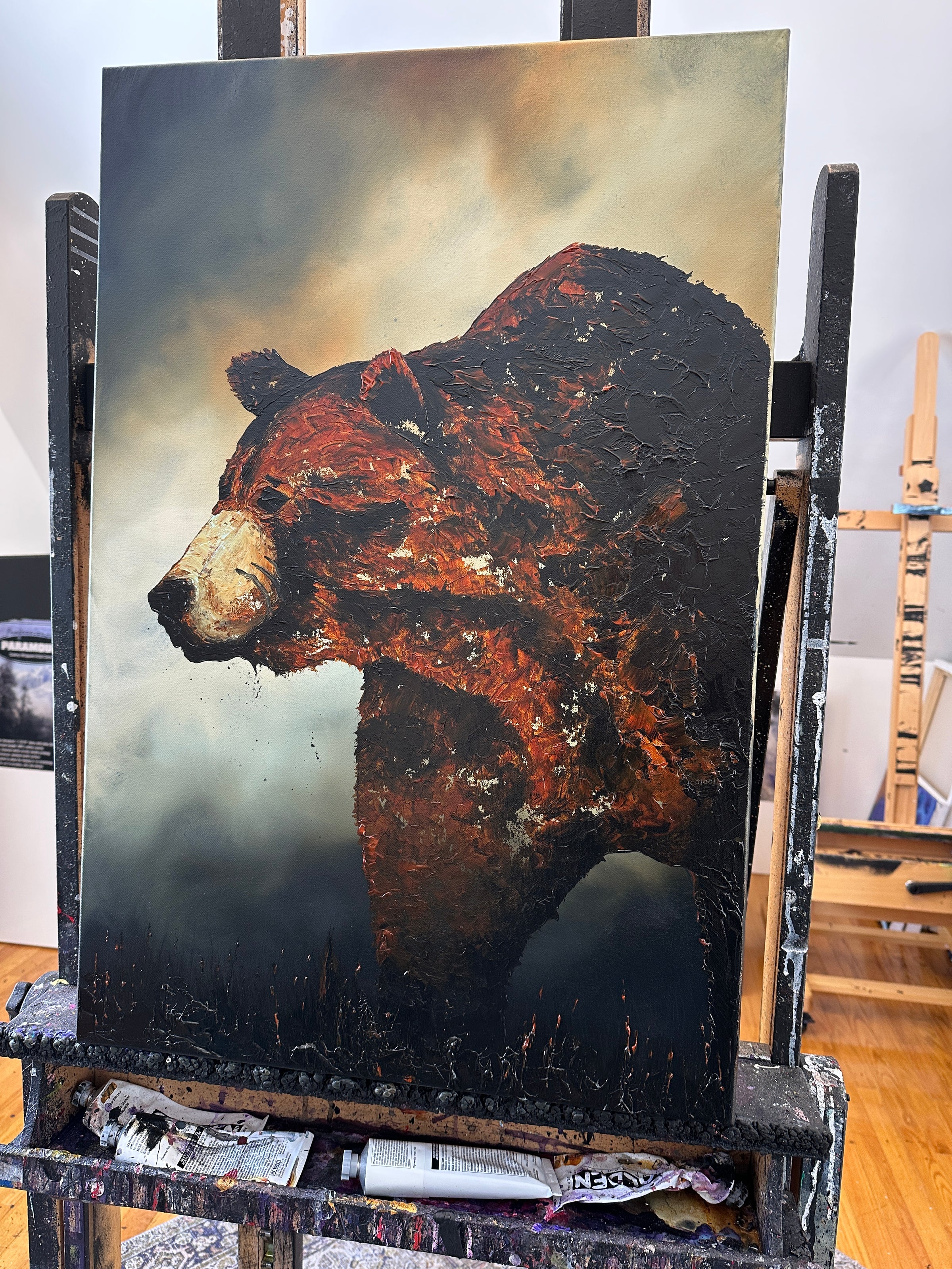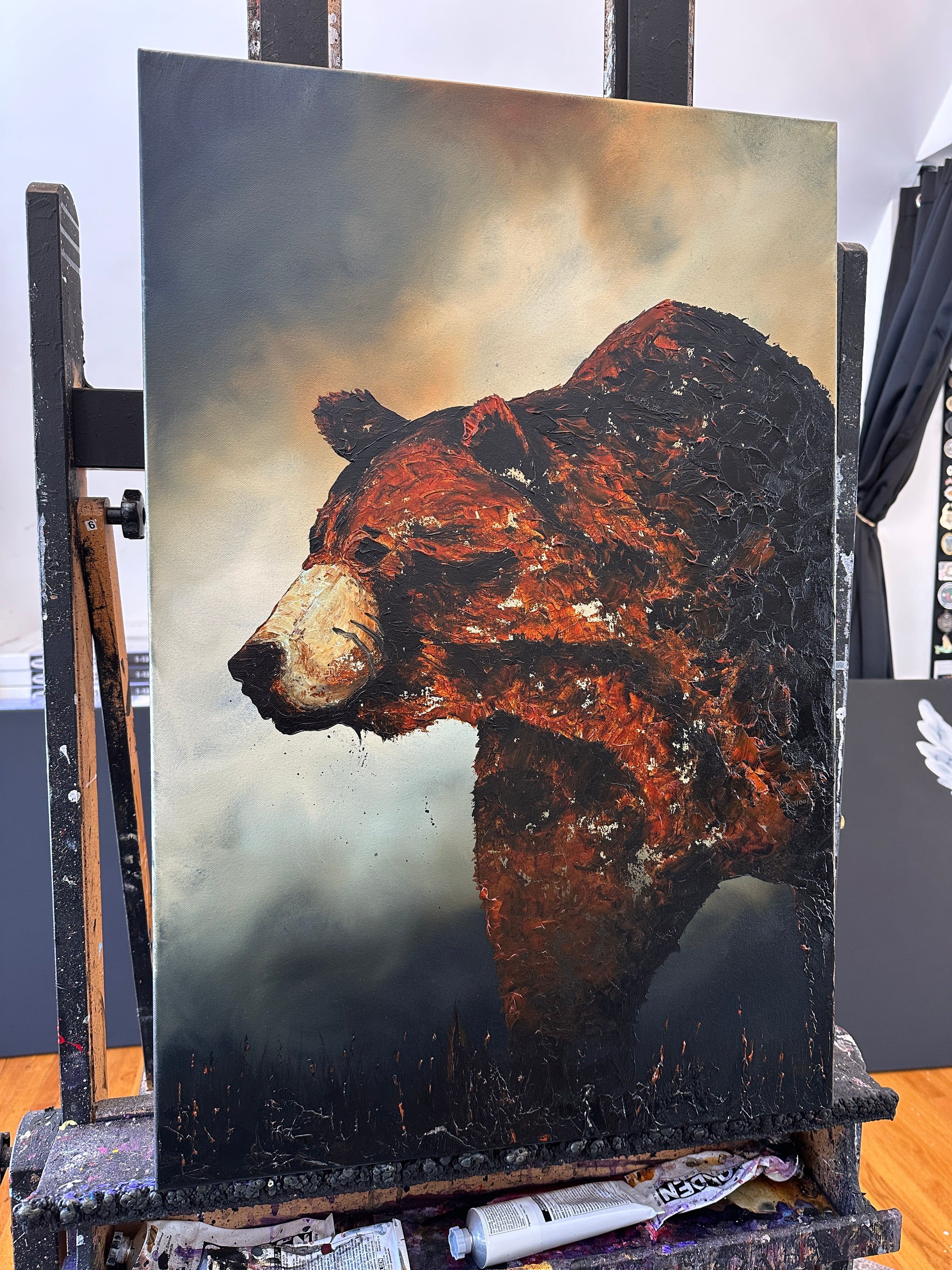 This powerful 20×30 inch original canvas captures the weathered majesty of a survivor through bold palette knife work and heavy body acrylics. Each sculptural stroke conveys the texture of scarred fur and the weight of experience, rendered in rich, earthy tones that pull you into the bear's unflinching gaze.