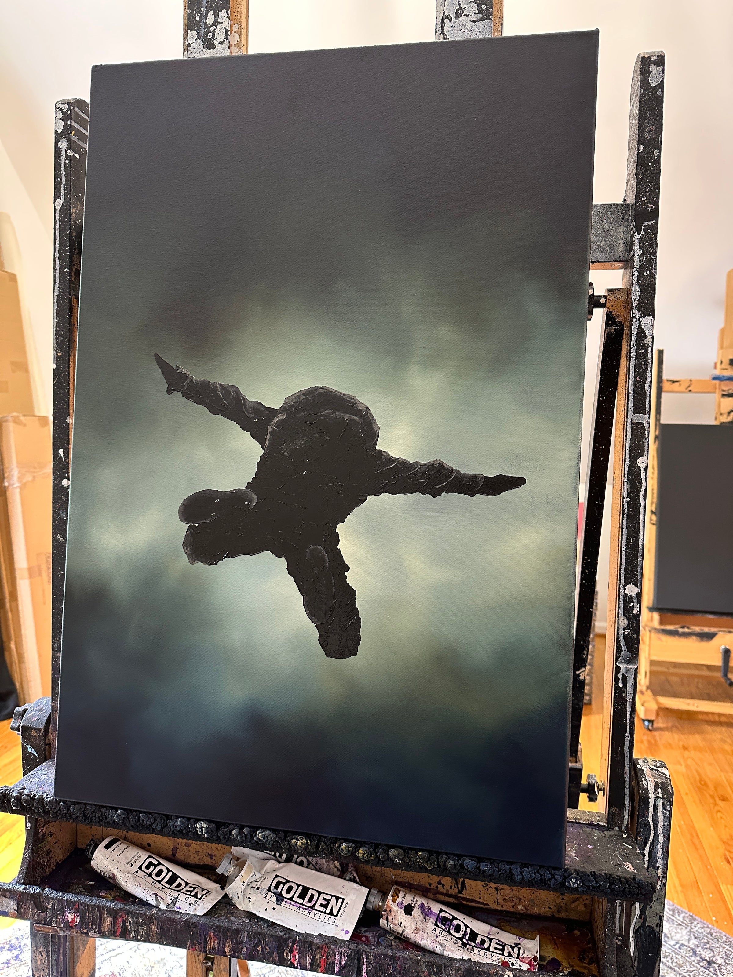"Exit Point", by Invader Girl, is a 1 of 1 original painting done in heavy body acrylics on canvas. It is 30" Tall and 20" Wide.