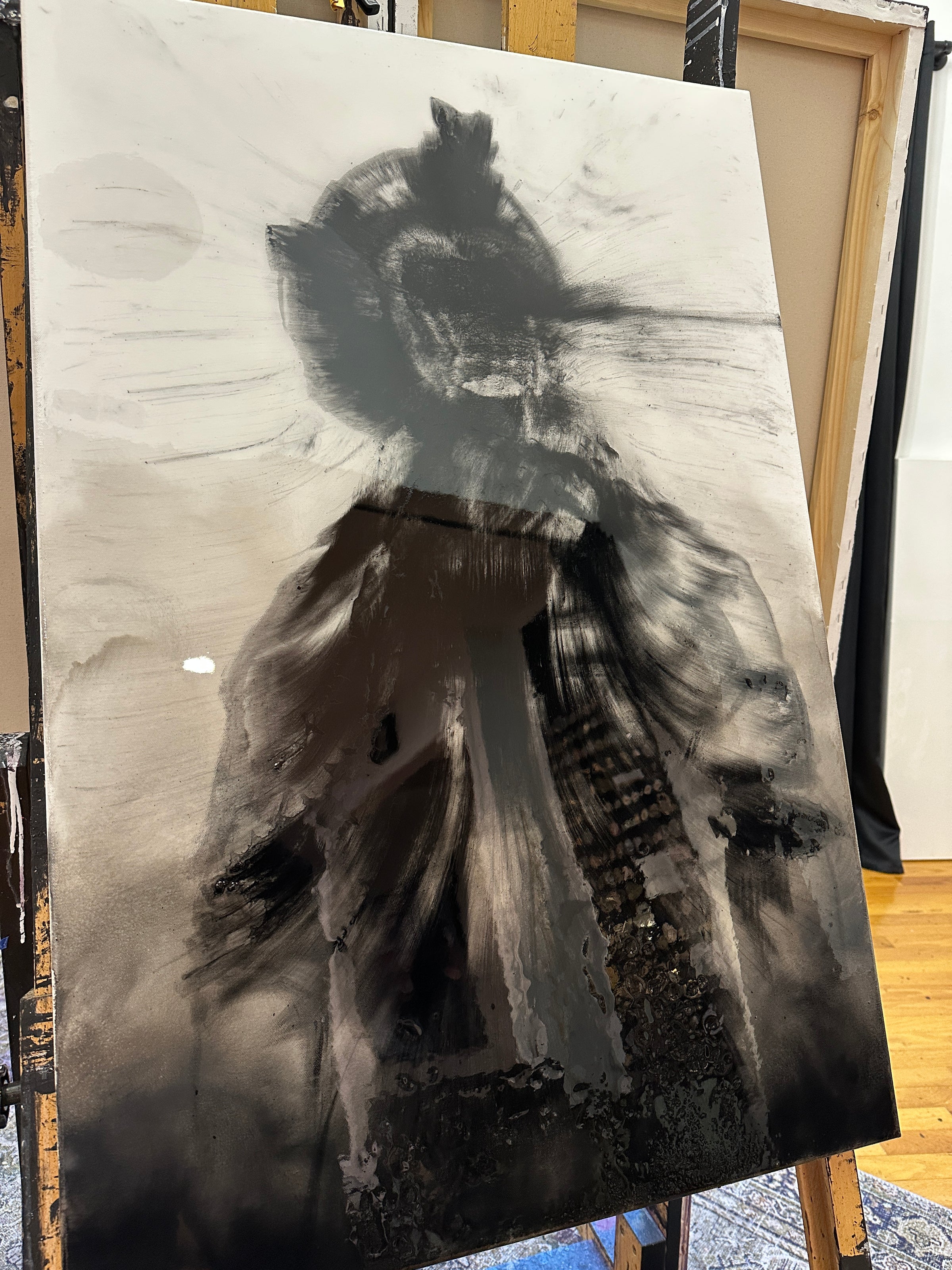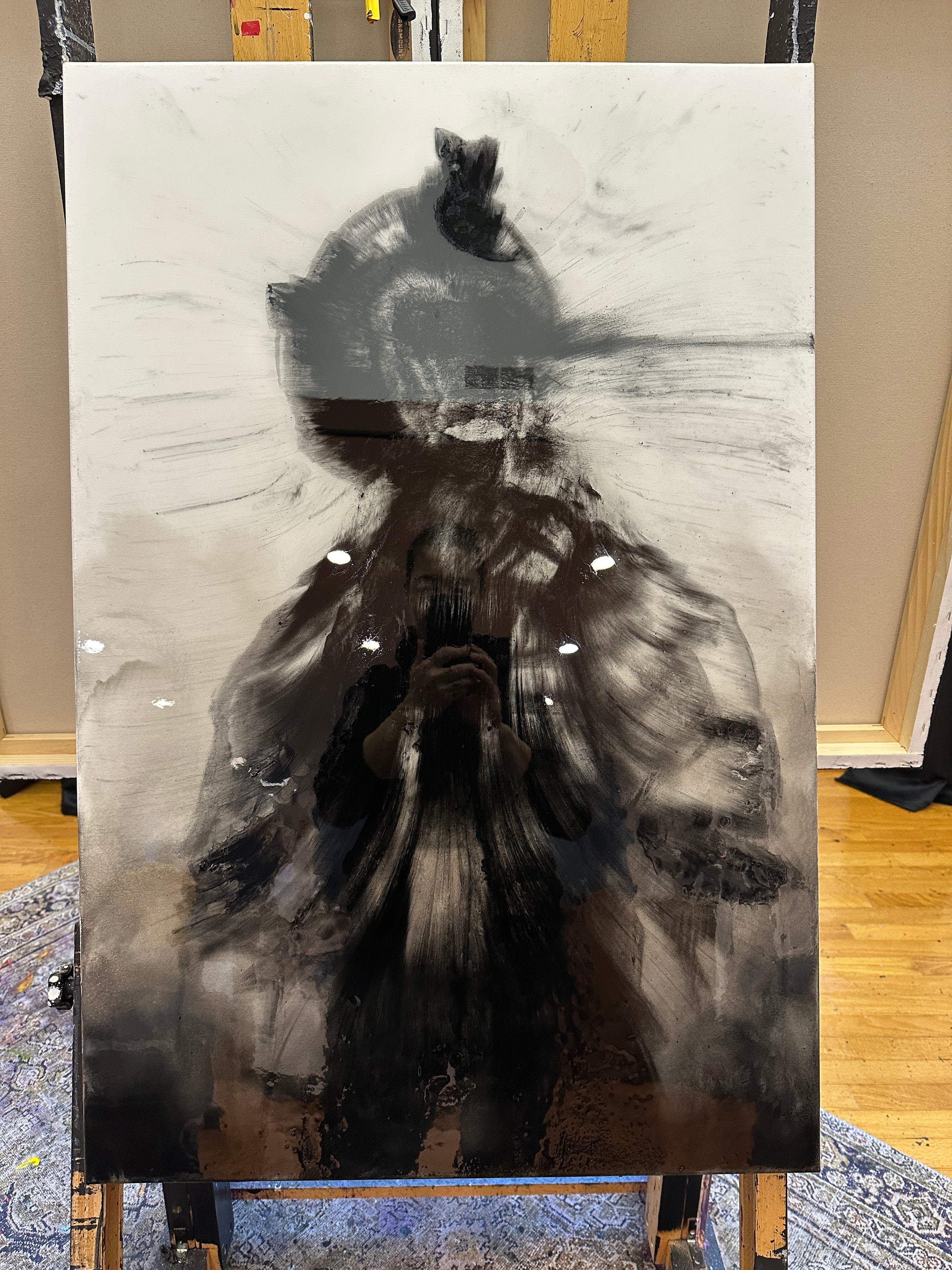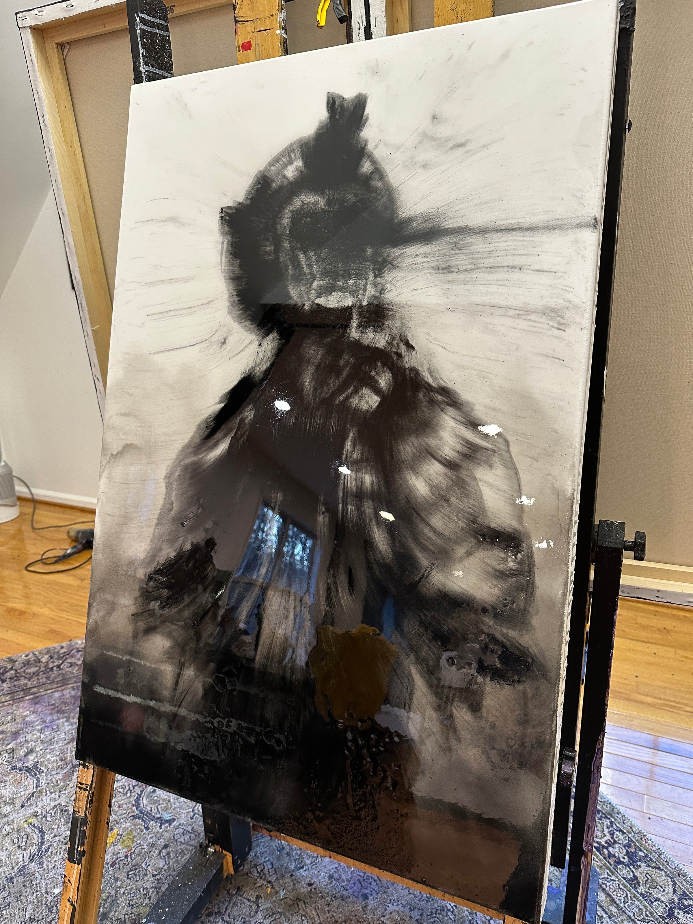 is the first of its kind , charcoal pulled directly from a fireside chat, hand mixed and placed by Invader Girl. Painting is encased in Art Resin to help preserve the painting.